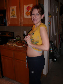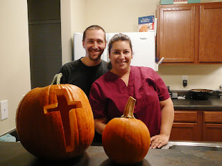 We stayed home for halloween to hand out candy to the kids. Sadly, since we live in a brand new development and we’re on the street with the model homes (unoccupied) and there are only a few occupied homes on our street (some vacant lots that haven’t sold yet and some model homes) we got very few trick or treaters. Next year we should get a ton. But we prepared! We carved our own pumpkins! I carved the top off mine so i could scoop out all the pumpkin poop and make seeds and bo actually carved a real design in his….. hahaha