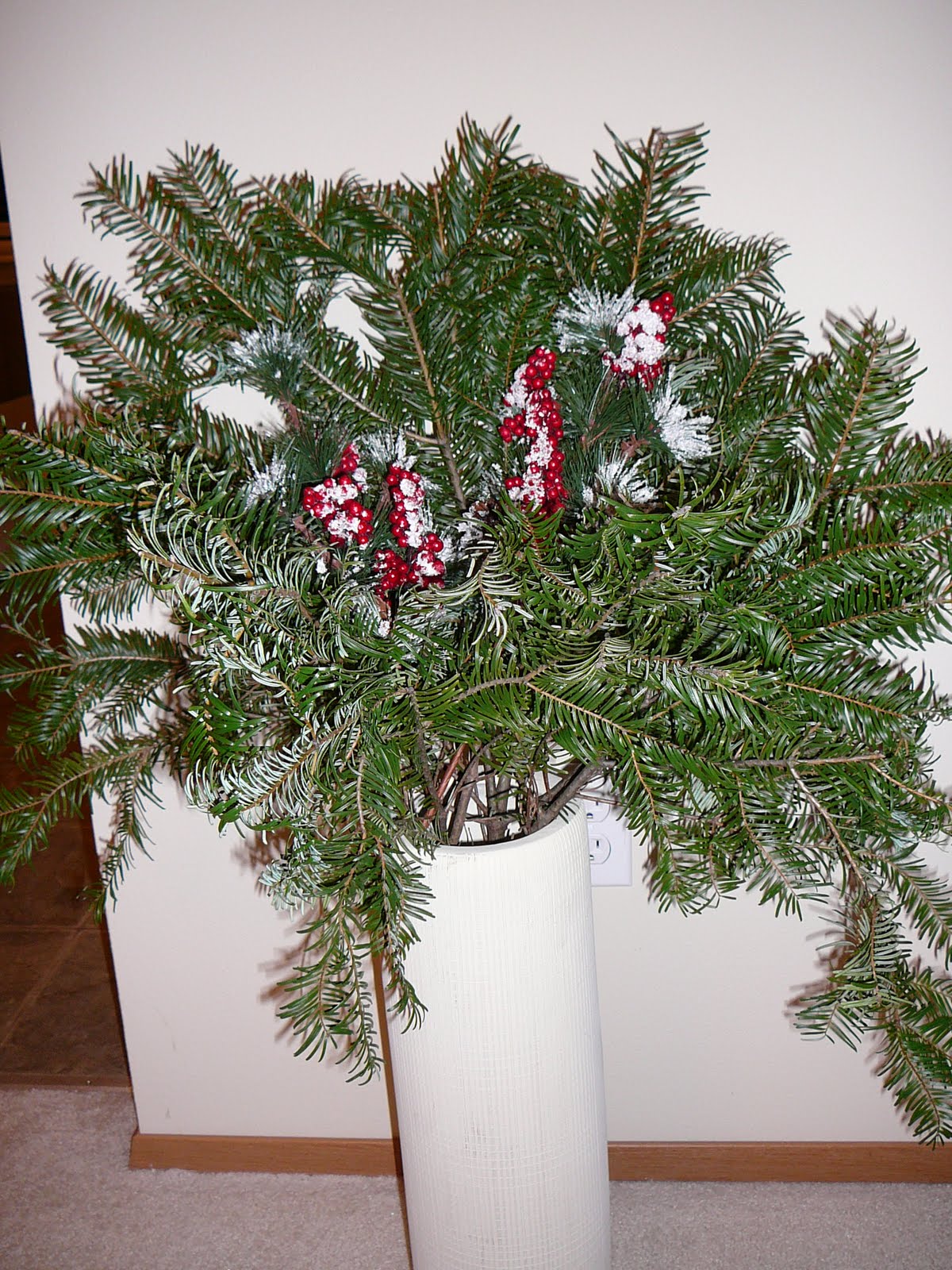 We also got our christmas tree today! We cut off the bottom and had to take a few of the branches off the bottom as well that were too low and I didn’t want to just throw them out because they look nice and smell good. So I took the twigs that we normally have in this vass out and put a large plastic cup in the bottom with water and christmas tree juice and put some of the branches in there, I think it looks nice and it smells great! Then I added the last 2 swags that I had left to this to tie it all in together!