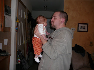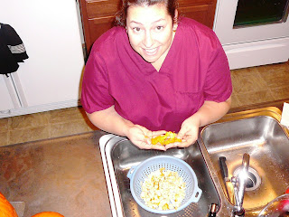 We stayed home for halloween to hand out candy to the kids. Sadly, since we live in a brand new development and we’re on the street with the model homes (unoccupied) and there are only a few occupied homes on our street (some vacant lots that haven’t sold yet and some model homes) we got very few trick or treaters. Next year we should get a ton. But we prepared! We carved our own pumpkins! I carved the top off mine so i could scoop out all the pumpkin poop and make seeds and bo actually carved a real design in his….. hahaha