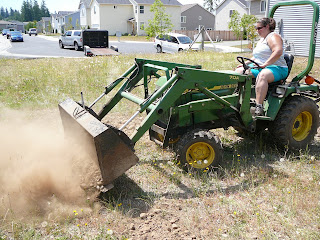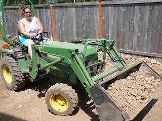 Dad arrived Saturday morning (thanks dad!!) with the John Deere & rock rake and gave Bo the low down on how he works… He told him that the rules are that he (dad) watches ONLY the house when he is driving the machine and if Bo gets run over it was his own fault cuz Bo needed to keep himself out of the way of the machine.